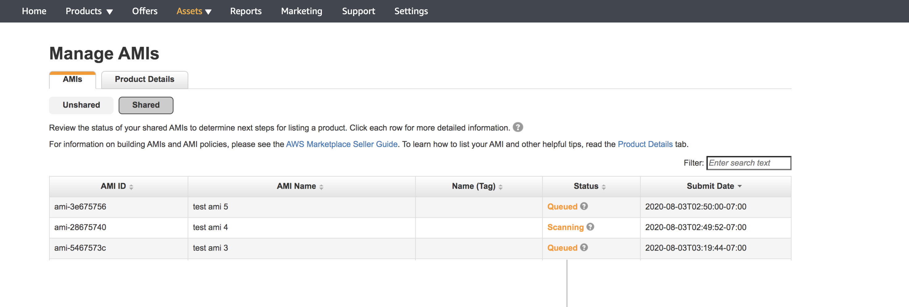 Sellers can view the number of AMIs submitted and their statuses as scanning.