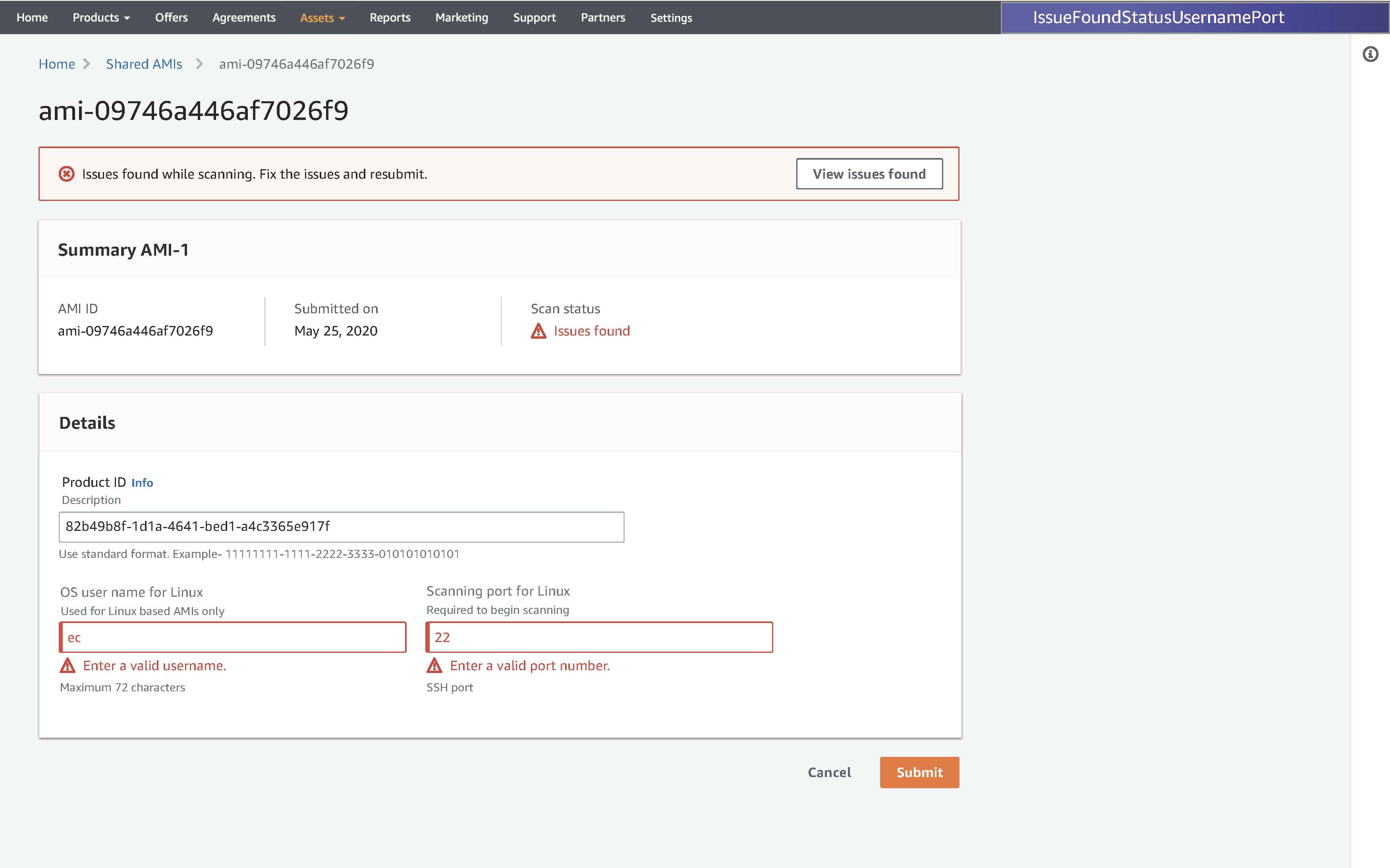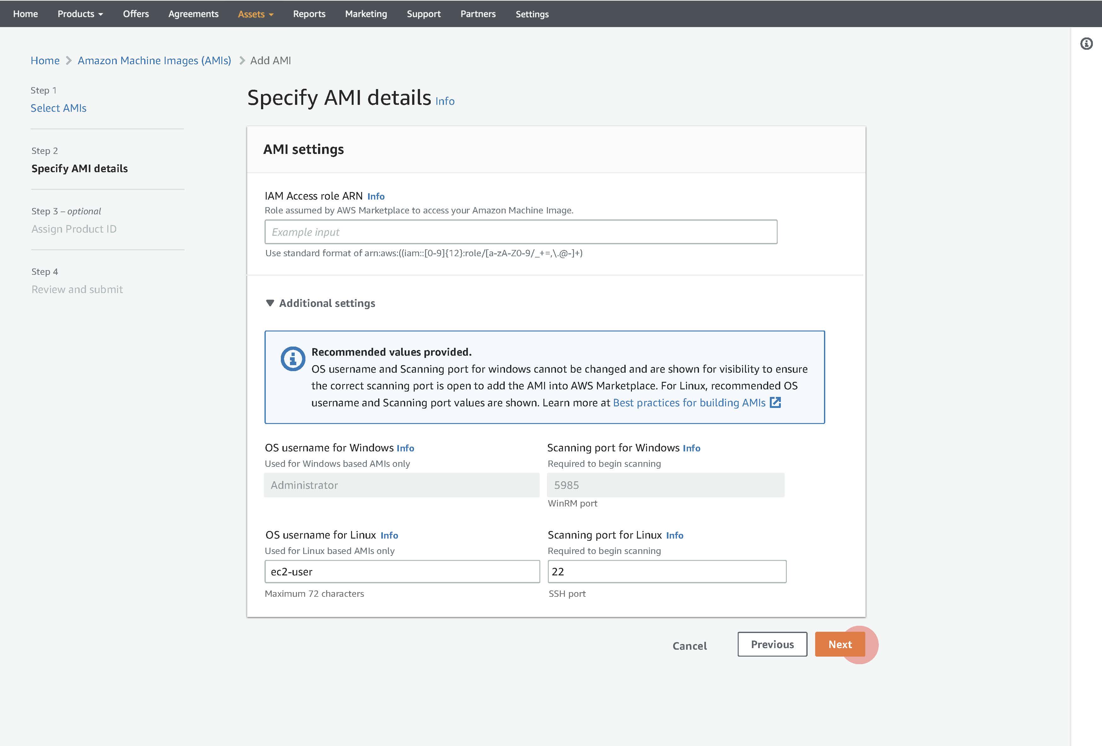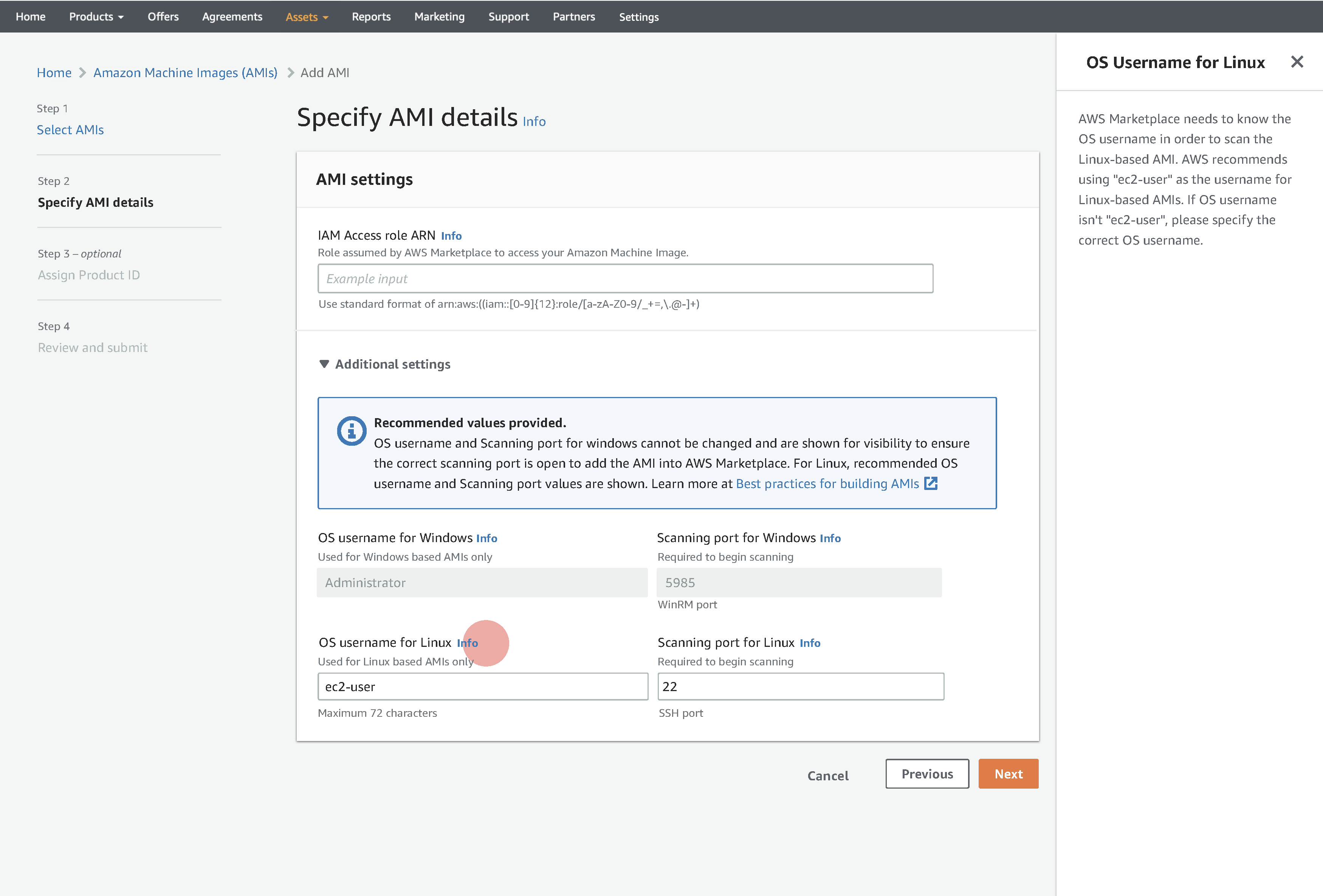 For linux base AMIs Marketplace need to know the scanning port as well as OS username in order to log in and scan AMI. It can take the default port number and OS username as mentioned.