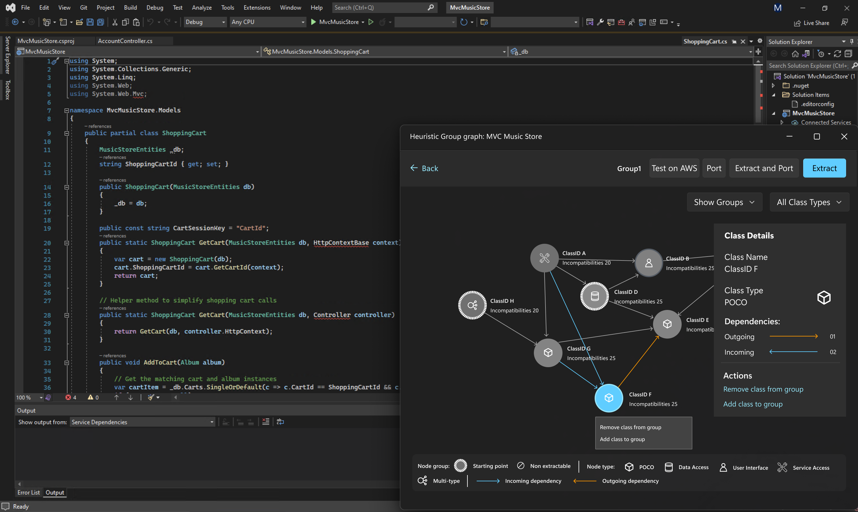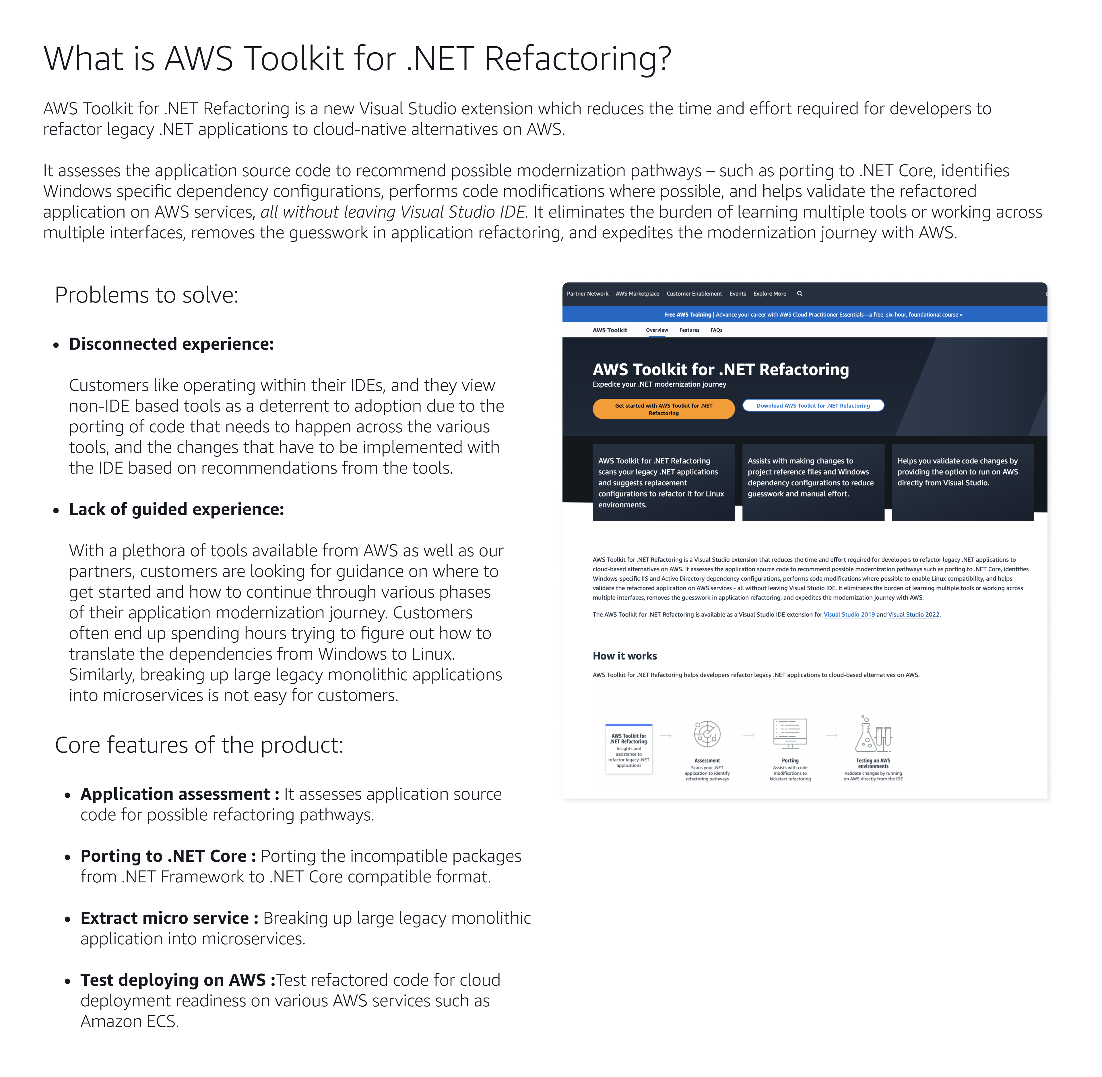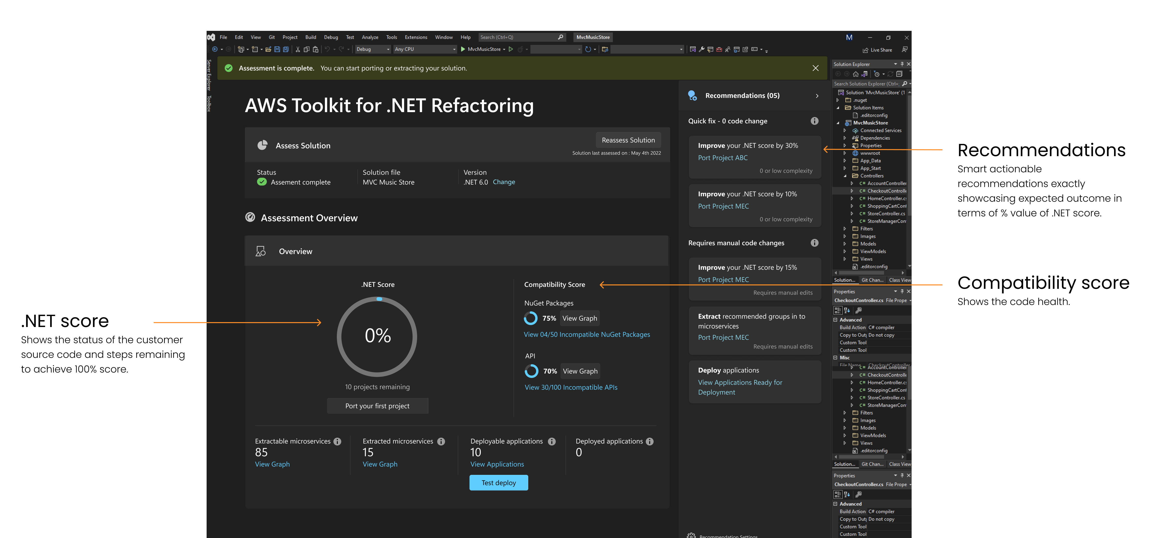 Discovery of the Microsoft Visual Studio extension on a VS Marketplace by searching keywords such as port, extract, refactor, modernize surfaces the toolkit extension. Developers can download, provide AWS credentials and start assessing their source code to get a report on the overview of their application.