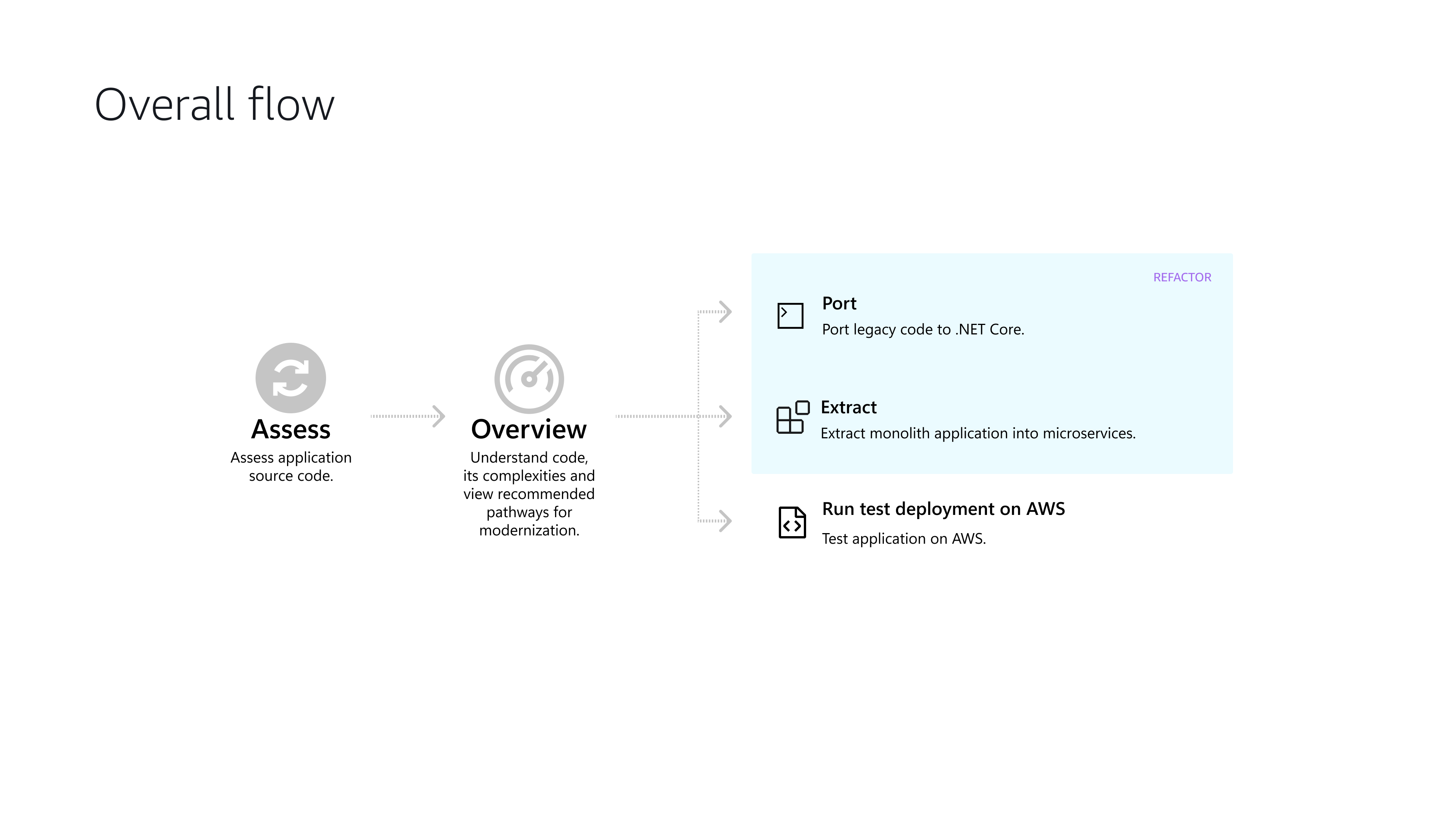 The following flow showcases customer assesing the source code as landing on a dashboard with overview. There are two paths to modernize the workload, 1. Port to .net core 2. Extract micro service and once ready they can test the application.