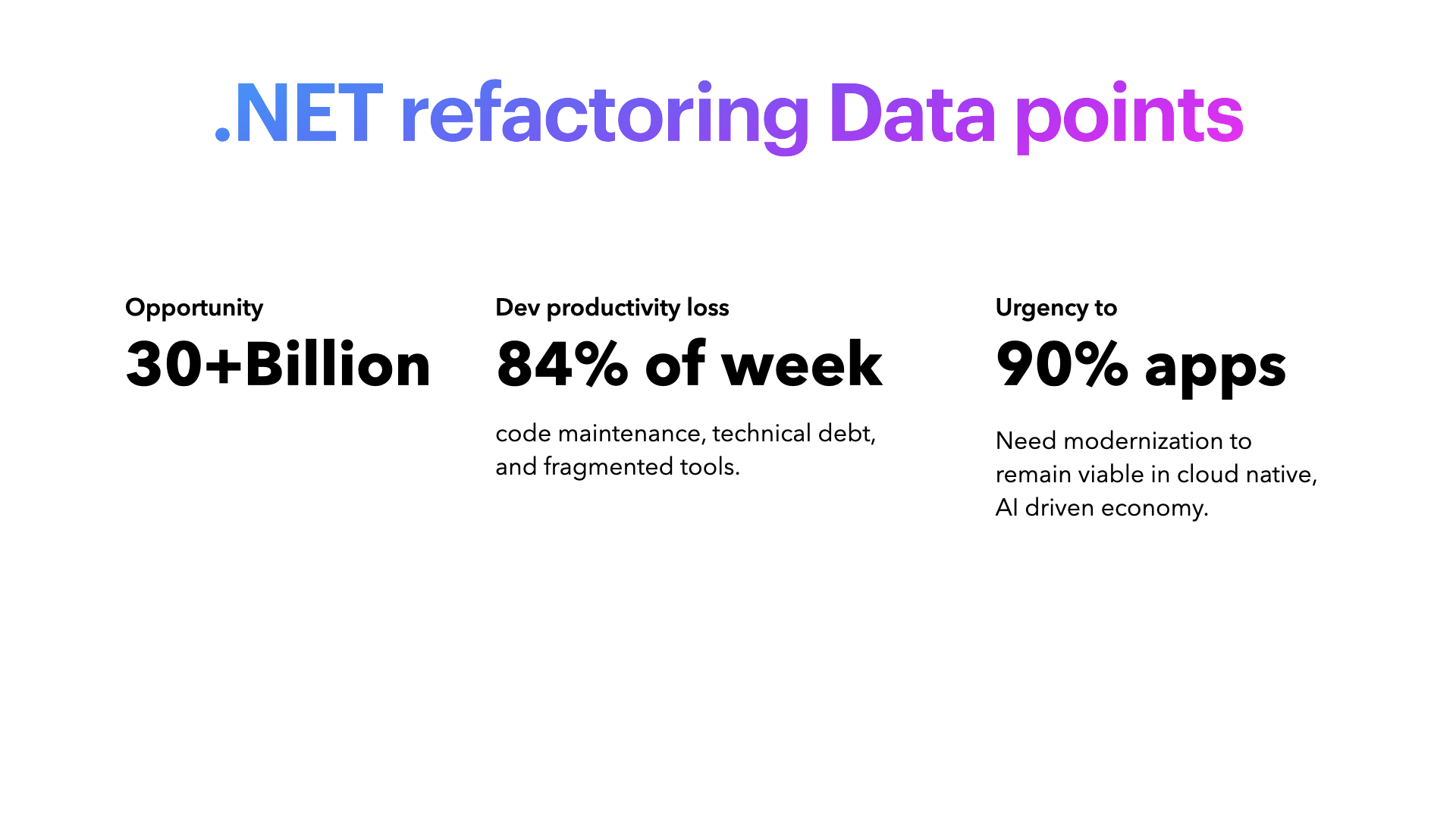 2. Modernization takes multiple years for customers. Reduce the time it takes for developers to modernize (refactor) code by bringing it from years to weeks.