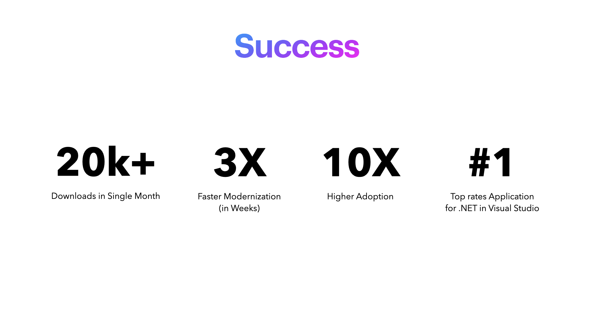 When we launched version 2 it became immediately a hit amongst developers, they loved the product as they could now plan their development sprints according to the recommendations. They now could get an exact % value of their modernization score. In Microsoft Visual Studio Marketplace the product had 30k+ downloads in first few months.