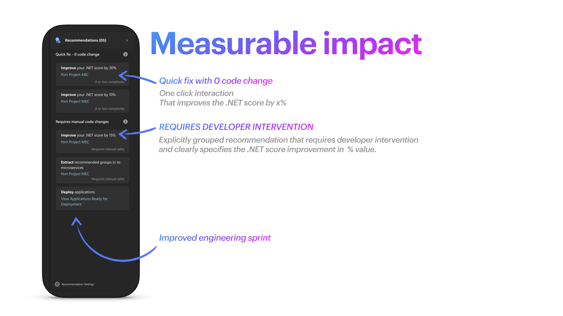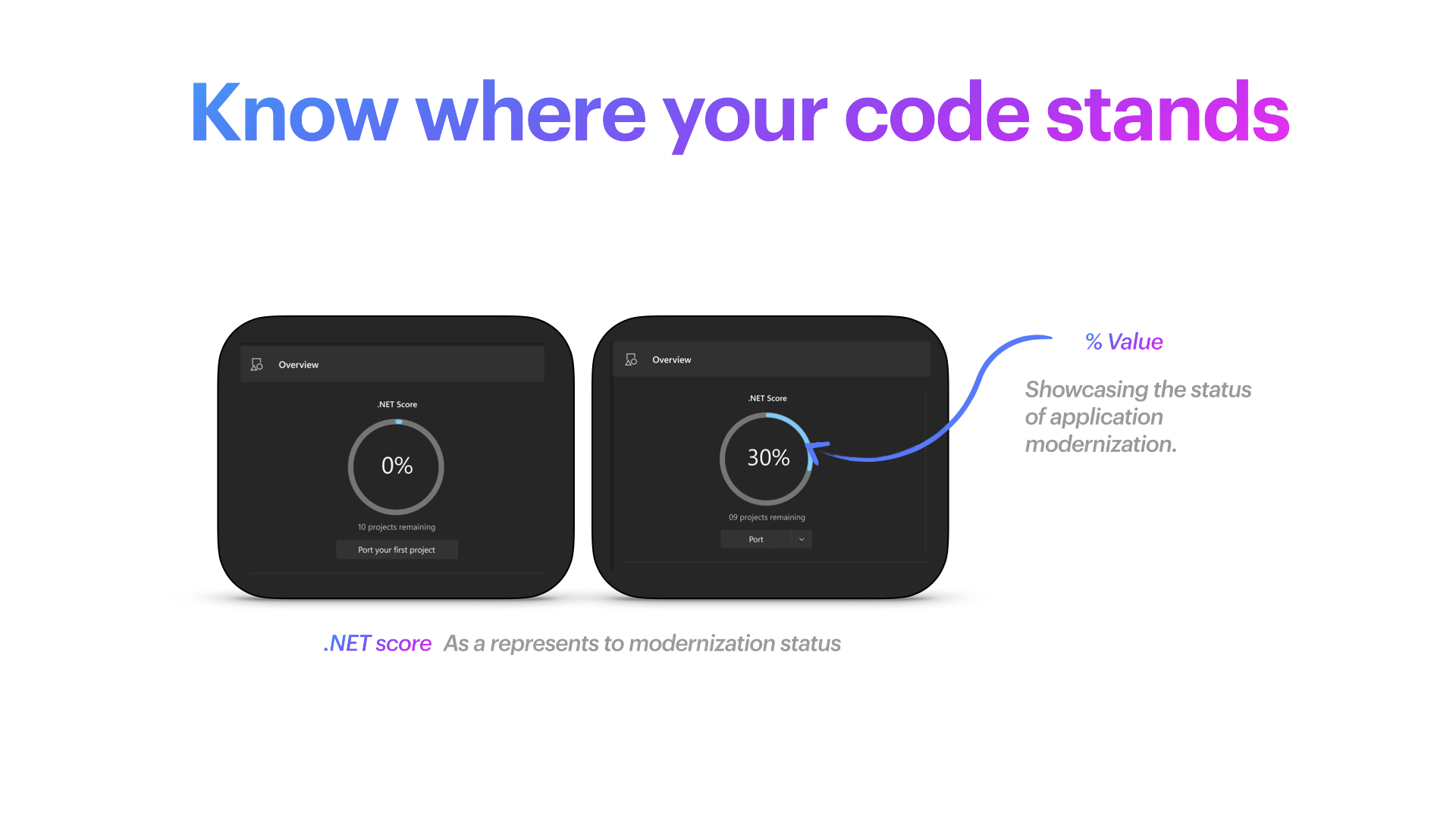 Users can get smart recommendation on actions that will exactly show them expected outcome in terms of % modernization achieved. One click to port recommended project gets them 30% .NET score, another click get them 20% more and so on.